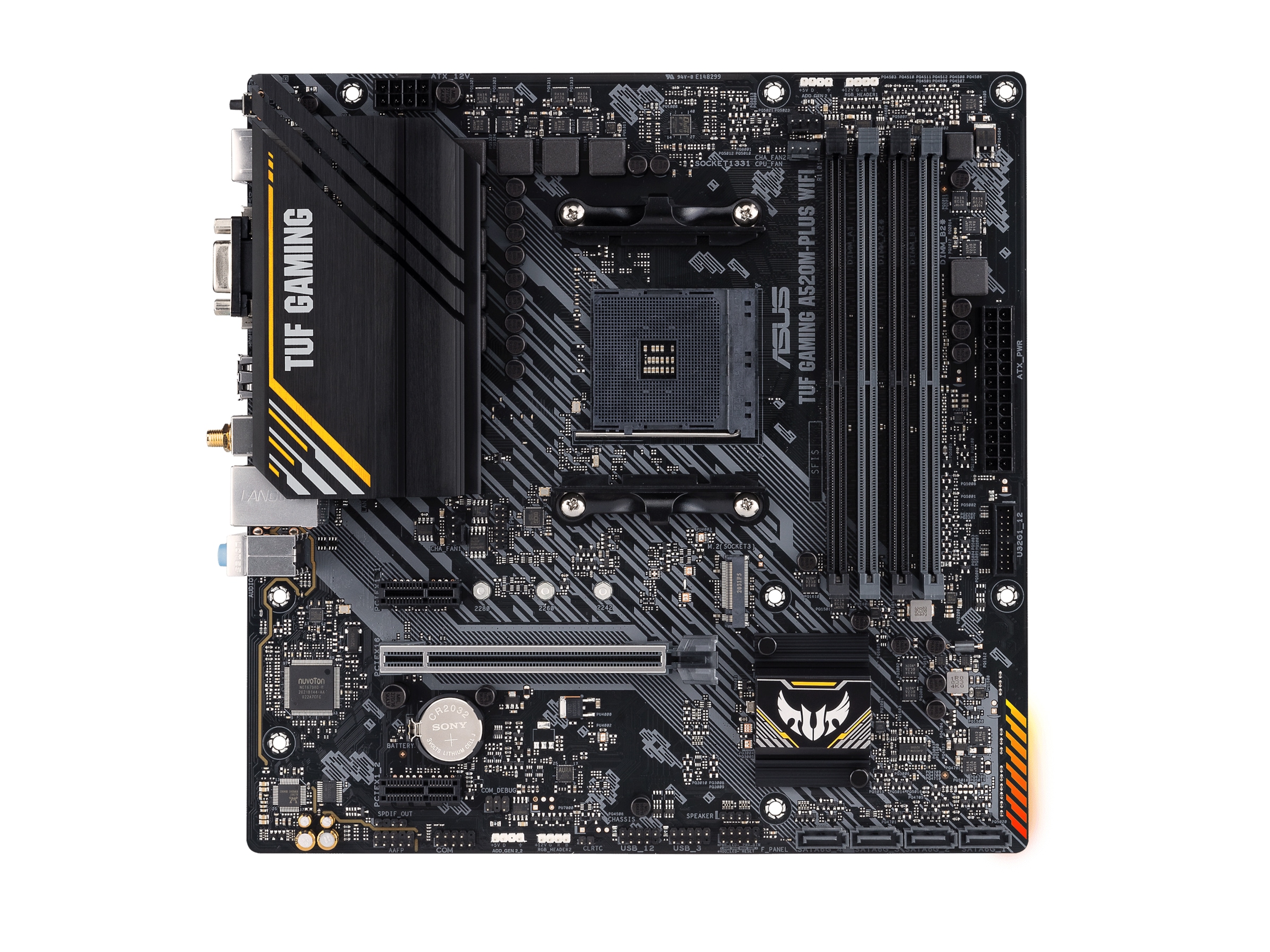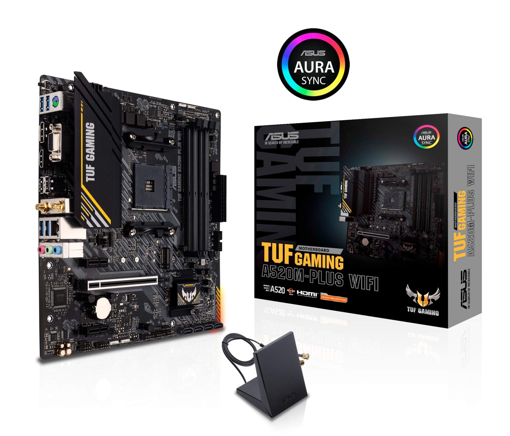 Asus TUF GAMING A520M-PLUS WIFI, AMD Socket AM4, A520, MicroATX, 4xDDR4, PCI Express, M.2 + SATA3 RAID, VGA/HDMI/DP, 7.1-ljud, USB 3.2, GigaLAN, WiFi 5, Aura Sync RGB