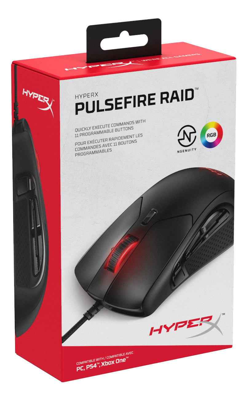 HyperX Pulsefire Raid™ är en lätt, ergonomisk mus som ser till att du alltid har fler kommandon nära till hands och sparar viktig tid när du behöver bygga snabbt, byta vapen eller försöker plundra och snabbt dra dig undan. Pulsefire Raid har elva programmerbara knappar och bekväma sidogrepp. Det gör denna mus till det perfekta pekdonet i stridens hetta, liksom i realtidsstrategispel och onlinespel med många användare. Den exklusiva Pixart 3389-sensorn garanterar precision tack vare integrerade inställningar på upp till 16 000 dpi. Den har ett utförande där de viktigaste vänster- och högerknapparna är delade för mer känsliga klick, oavsett var du trycker på dem. Dessutom ger de tillförlitliga Omron-brytarna snabb taktil återkoppling så att du kan vara säker på att klicken verkligen registreras. Du kan konfigurera makron, justera dpi-inställningar och anpassa RGB-belysningen med hjälp av anpassningsprogrammet HyperX NGENUITY. De stora tassarna i kombination med den böjliga flätade kabeln följsamt och kontrollerat glid. Musen har stöd för flera olika plattformar så att du kan utnyttja Pulsefire Raids fördelar till fullo och dominera både i data- och konsolspel.