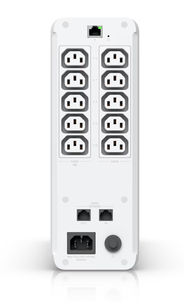 UniFi managed 1kVA uninterruptible power supply with 10 outlets and hot swappable battery, 108Wh, half load (300W) runtime of 7 minutes, UniFi Alarm Manager ready and NUT support for 3rd party devices.