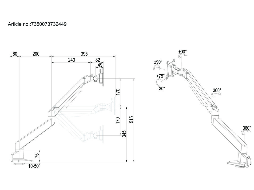 • Clamp and through-hole mounting options for desks up to 50mm thick