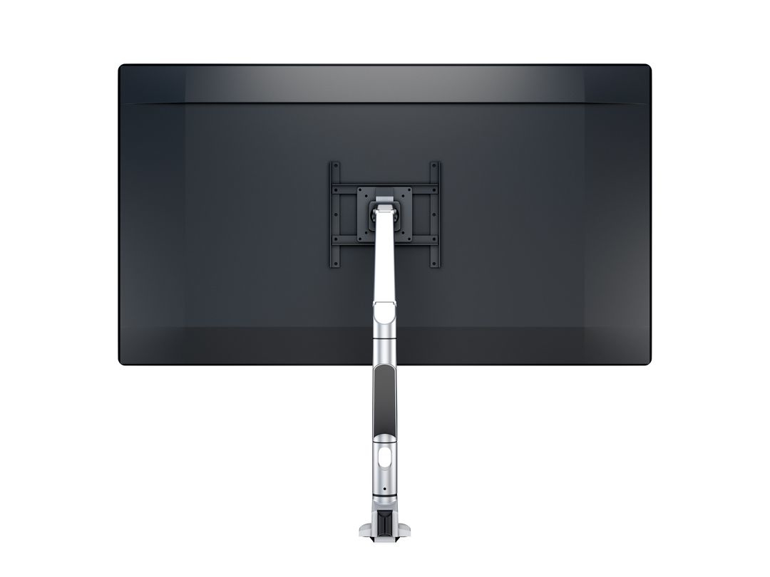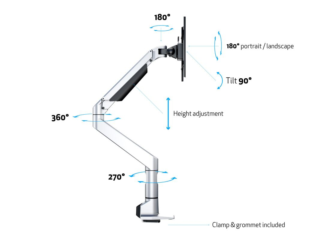 The snap-on VESA head enables fast assembly and disassembly, ideal for IT departments aiming to reduce downtime. The arm can be securely clamped or mounted through the desk surface (up to 50 mm thick). Available in silver, black, and white finishes, it suits modern work environments.