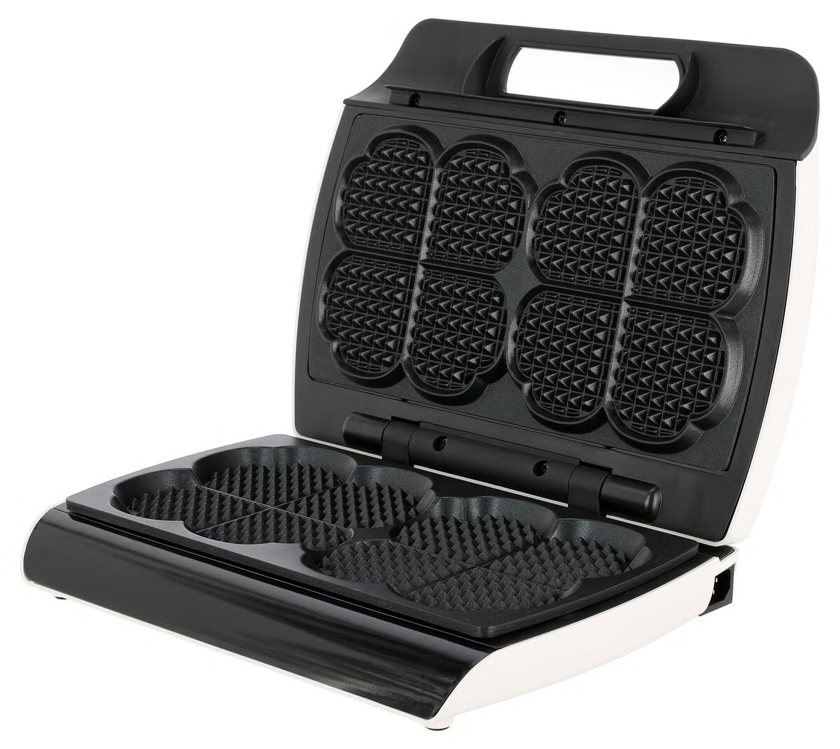 Laggarna är lite djupare och det finns en kanal mellan de två våffelformarna som minskar risken för spill. Överflödig smet rinner över i den andra laggen istället för över kanten. Plattorna i våffeljärnet är tillverkade av tjock gjuten aluminium med non stick-beläggning. Beläggningen gör att våfflorna inte fastnar och att järnet blir lättare att göra rent. Handtaget är tillverkat i plast och designat så att du inte ska bränna dig. De två våfflorna har formen av vardera fyra små hjärtan och har en storlek på 14 cm i diameter. Kabeln är 1,3 meter lång och effekten är 1600 W. Våffeljärnet kan förvaras på högkant, vilket underlättar vid förvaring.