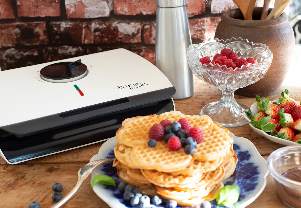 Grädda frasiga våfflor i det klassiska dubbeljärnet Åviken. Våffeljärnet signalerar när järnet uppnått rätt temperatur. Det talar också om för dig när de två hjärtformade våfflorna har gräddats så som du vill ha dem och är redo att ätas.