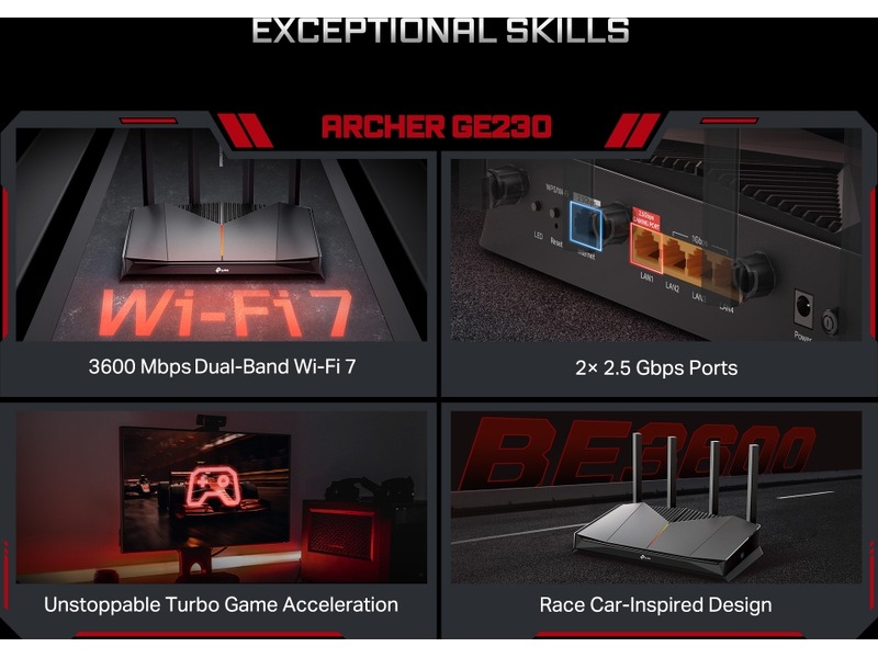 Trådlös router TP-Link Archer GE230, WiFi 7 BE3600, Dual-Band, 1x2.5GbE WAN + 1x2.5GbE LAN + 3x1GbE LAN, RGB