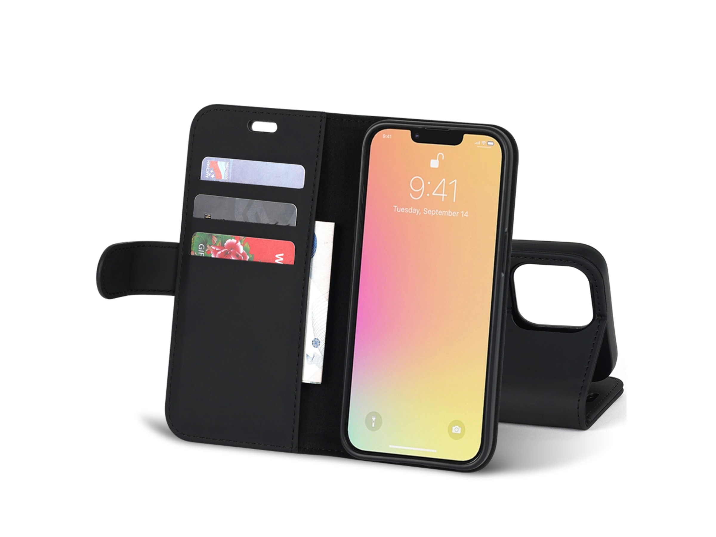iPhone 13, plånboksfodral, svart 3 kortfickor, magnetisk stängningsmekanism