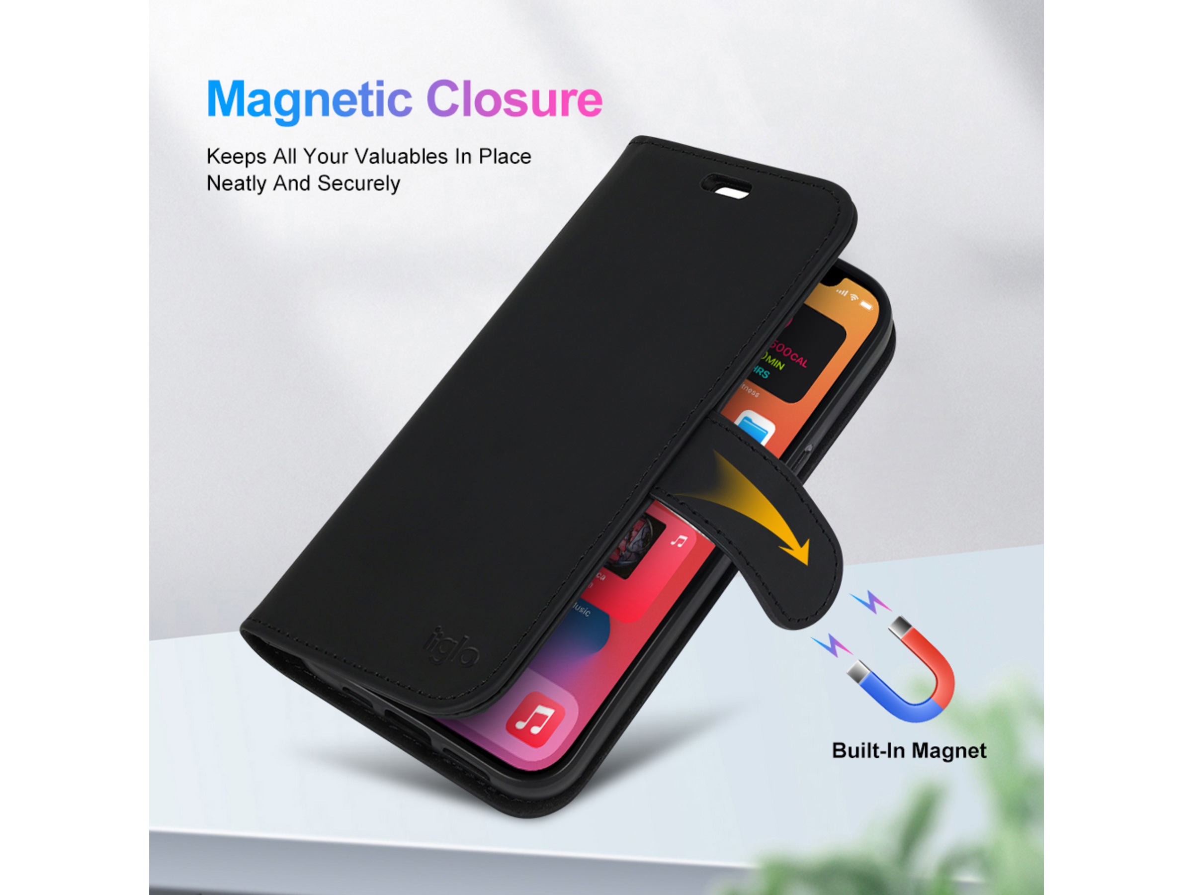 Skydda din iPhone med ett iiglo iPhone-plånboksfodral i svart. Fodralet är tillverkat av premium PU-läder som är ett mjukt och slitstarkt material. Fodralet skyddar mot stötar och repor. Magnetfunktionen säkerställer att fodralet hålls stängt, även när telefonen ligger i jackfickan eller PC-fodralet.