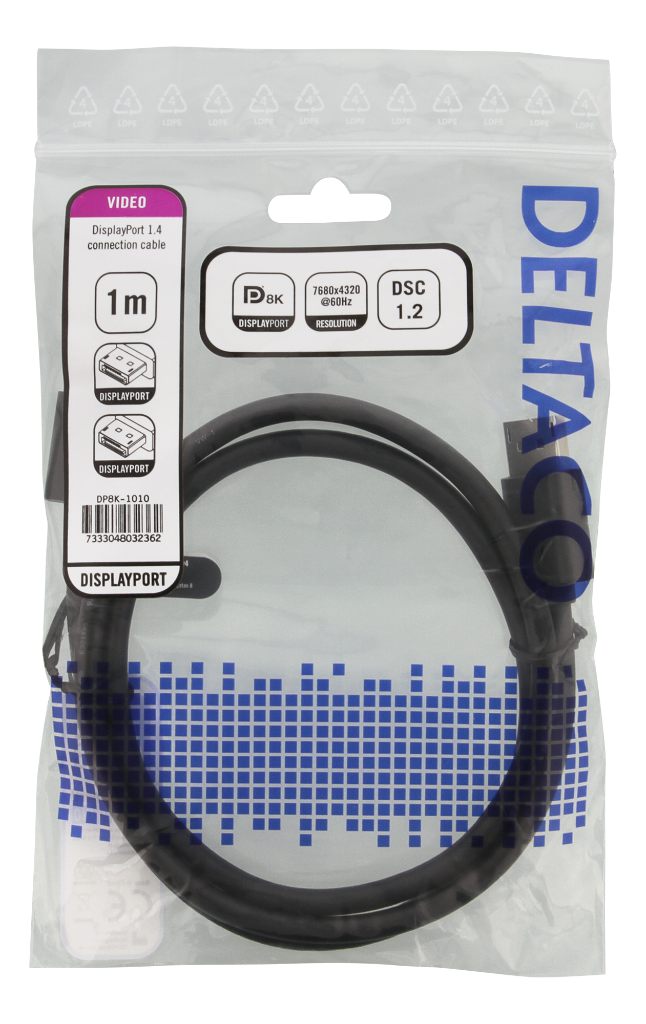 DisplayPort-kabel, DP 1.4, 8K@60Hz, Deltaco, 1 meter - Svart